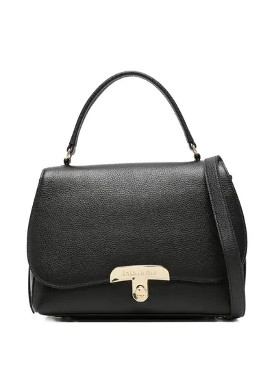 black leather top handle detachable shoulder strap gold-tone hardware logo detail clasp fastening