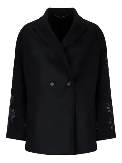 black floral appliqué two-button fastening lapel collar long sleeves straight hem