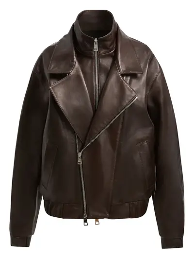 chocolate brown leather double zip fastening high neck collar ribbed hem and cuffs