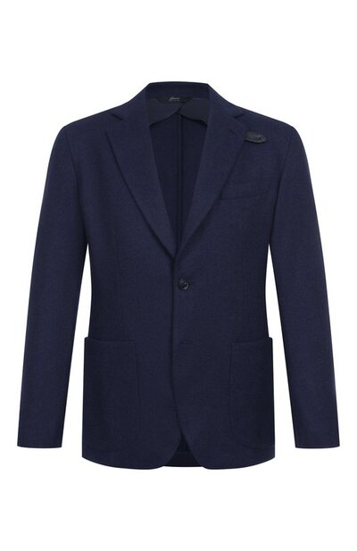 Однобортный пиджак со съемным кожаным ремешком, помогающим застегнуть прямоугольные лацканы наглухо, дополнили внутренним и тремя внешними карманами. Края модели из чистого кашемира прошили ручными стежками пунто.