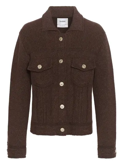 brown ribbed knit button fastening two chest pockets spread collar buttoned cuffs