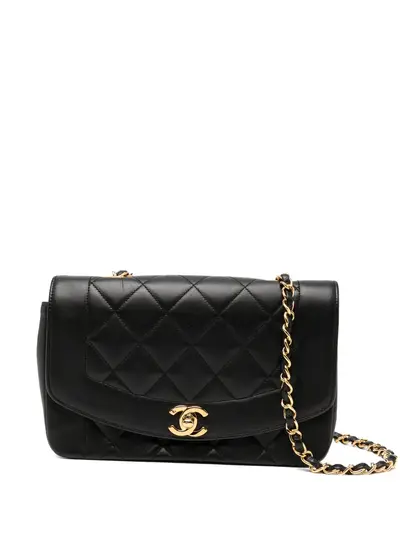 circa 1991 black front buckle fastening front flap closure chain-link shoulder strap gold-tone logo plaque main compartment Condition: GOOD. This previously owned and used item is in good condition with minimal signs of use. This may include fading of material or plating and scratches.