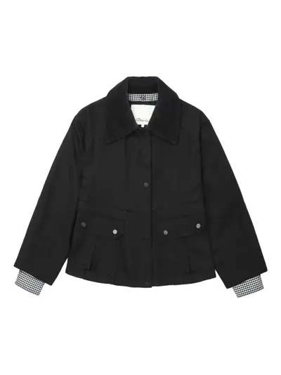 black cotton check trim corduroy collar button fastening front flap pockets buttoned cuffs