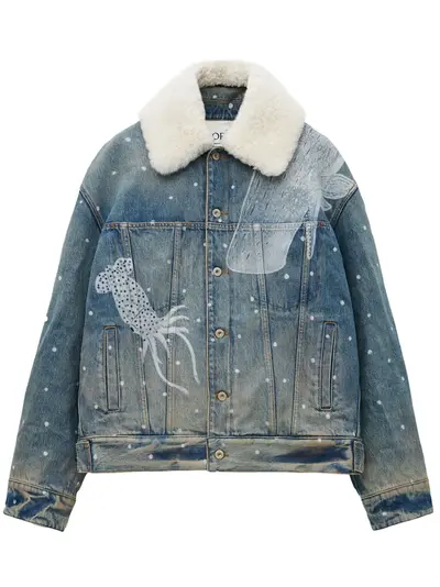 Jacket in medium-weight washed cotton denim featuring a placed Deep Sea digital print and a removable shearling collar. This jacket is part of the LOEWE x Suna Fujita collection.Colour : Mid Blue DenimRelaxed fit, regular lengthButton front fastening, buttoned cuffs with animal cufflinksChest patch pockets, welt pocketsQuilted liningLOEWE embossed leather patch placed at the back