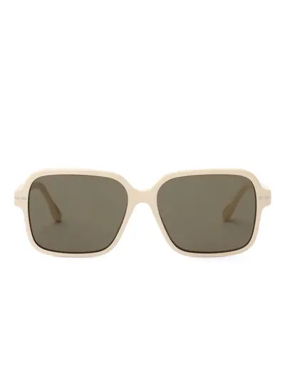 off-white square frame brown lenses subtle branding temple detailing smooth finish These glasses come with a protective case.