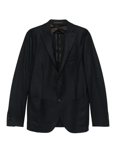 dark blue button fastening flap pockets notched lapels long sleeves buttoned cuffs