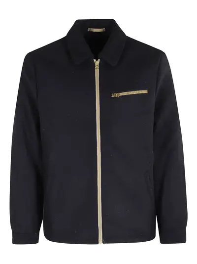 blue front zip fastening point collar side welt pockets buckle detail long sleeves