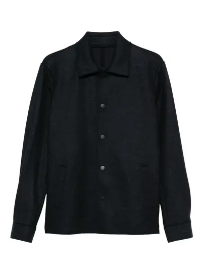blue/ grey polo collar long sleeves knitted wool jacquard single-breasted snap button fastening buttoned sleeve cuff raw-edge finis