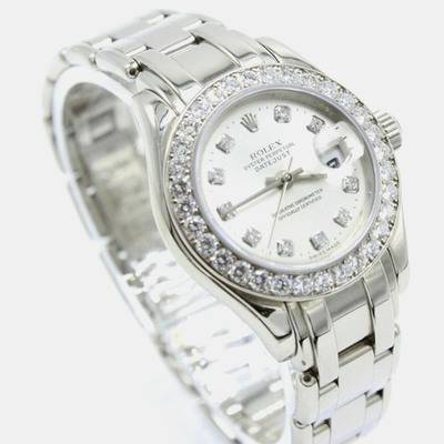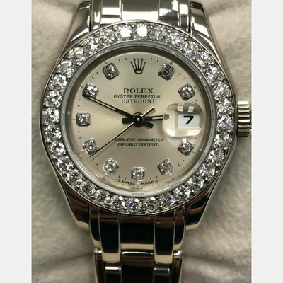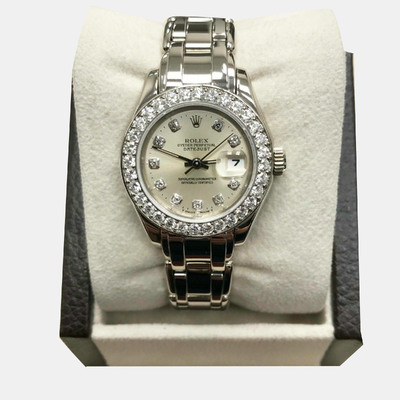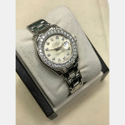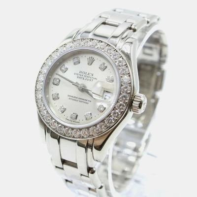 Crafted in 18K white gold, the Rolex Pearlmaster 69299 combines fine materials with diamond hour markers on a silver dial. The 29 mm case houses an automatic movement for accurate timekeeping. A refined watch suited for special occasions or daily use.