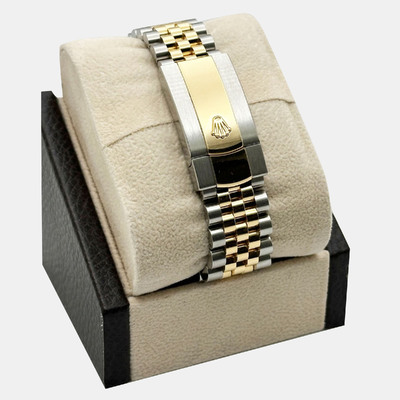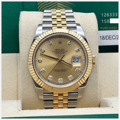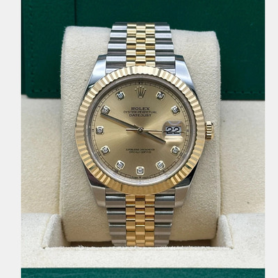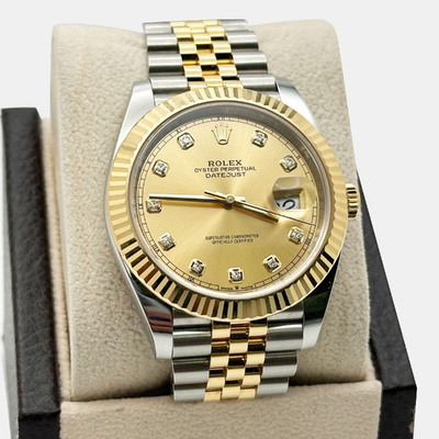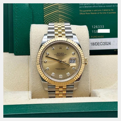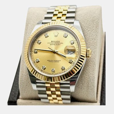 This Rolex Datejust 126333 features a two tone mix of stainless steel and 18K yellow gold, paired with a champagne dial and diamond hour markers. At 41 mm, it offers modern sizing with classic styling, powered by an automatic movement.