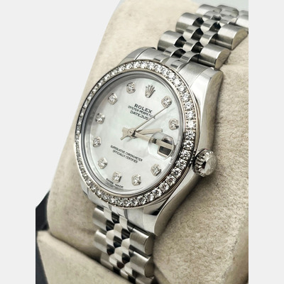 This Rolex Datejust 31mm features a stainless steel case paired with a diamond set bezel and a Mother of Pearl dial. Automatic movement ensures reliability, while the blend of fine materials adds visual interest. A versatile timepiece suited for both daily wear and special occasions.