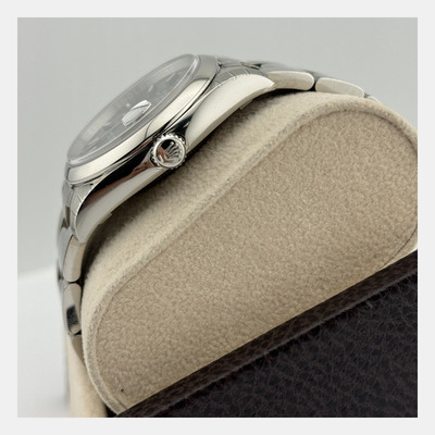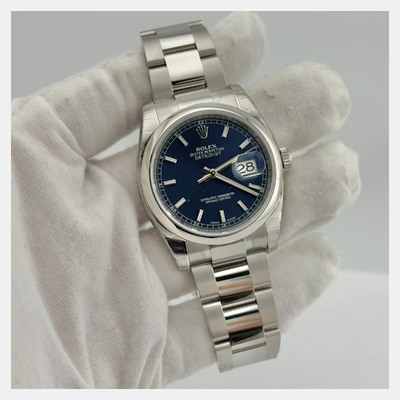The Rolex 116200 features a 36 mm stainless steel case and a sharp blue dial. Known for its reliability, the automatic movement and Oyster bracelet make this a go to choice for those who want a low key Rolex with classic features.