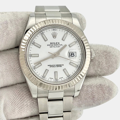 This Rolex Datejust II features a crisp white dial housed in a 41mm stainless steel case. Fitted with an automatic movement and a fluted bezel, its a well balanced watch designed for everyday wear.
