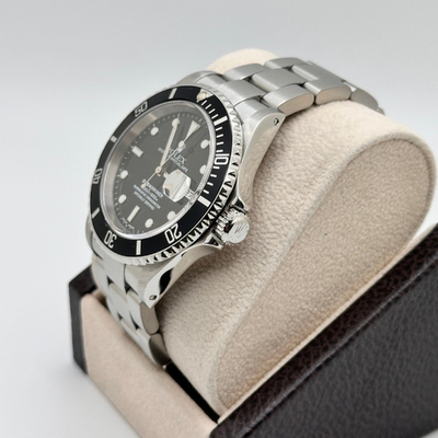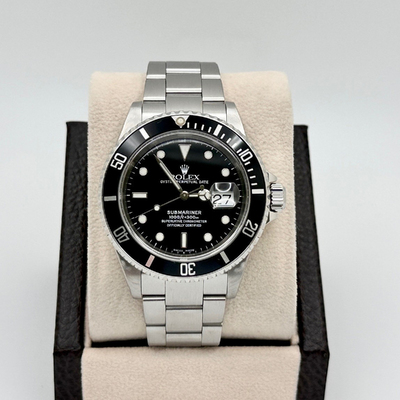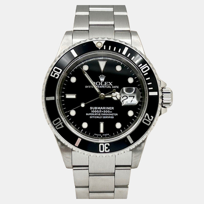 The Rolex Submariner Date 16610 pairs an automatic movement with a 40mm stainless steel case and black dial. Designed for function and daily wear, this model includes a date window and a unidirectional bezel, making it a favorite among dive watch enthusiasts.
