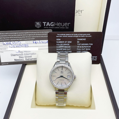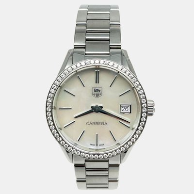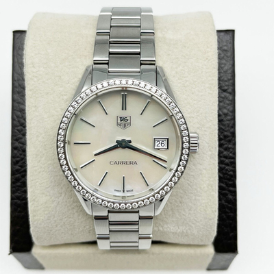 The TAG Heuer WAR1315 brings subtle luxury to the wrist with a glimmering mother of pearl dial punctuated by diamond markers. Sleek and feminine at 32mm, it’s a timepiece that elevates everyday wear without ever overpowering it. Built for women who favor elegance that doesn’t whisper—but speaks with quiet confidence.