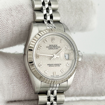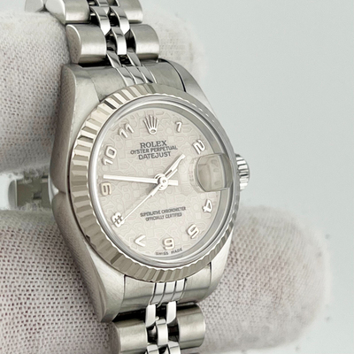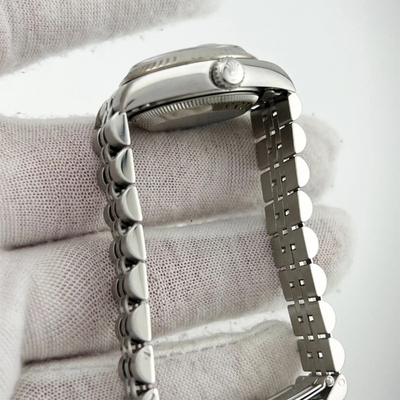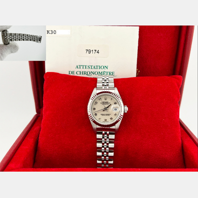 The Rolex Datejust 79174 brings classic refinement in a 26 mm stainless steel case, complemented by an 18K white gold bezel. Its clean design and precise automatic movement make it a versatile everyday luxury piece, perfect for both professional and elegant occasions.