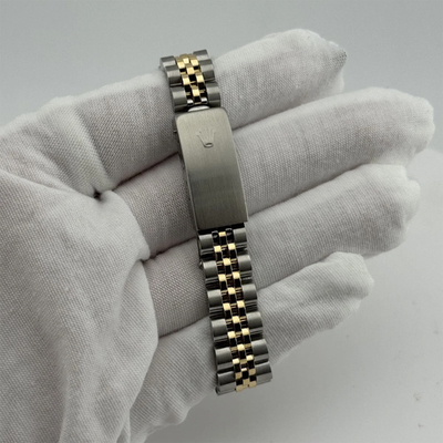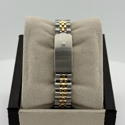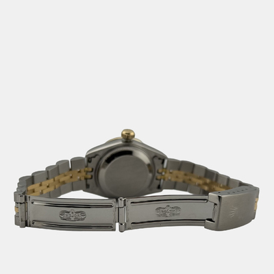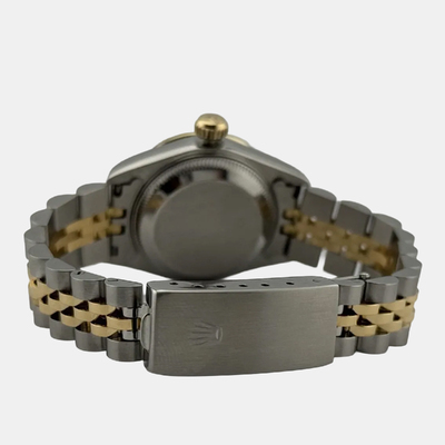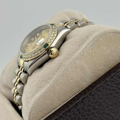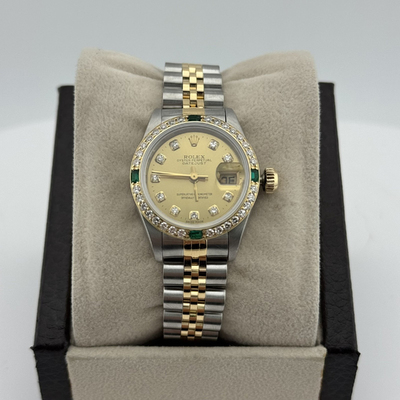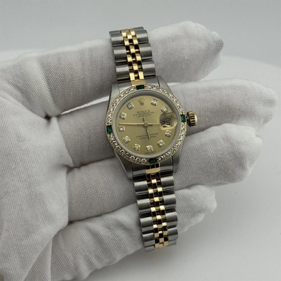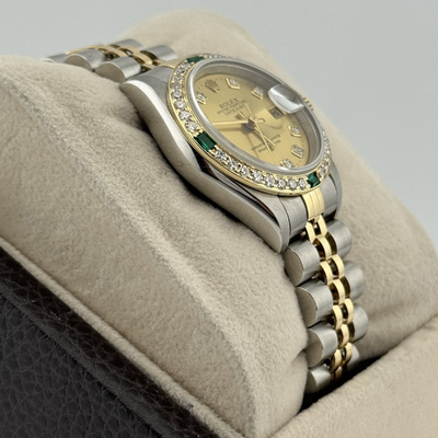 A classic womens Rolex Datejust with a 26mm case in stainless steel and 18K yellow gold. Features include an automatic movement, a fluted bezel, and a champagne dial set with diamond hour markers and emerald accents. A reliable and eye catching piece for daily wear or special occasions.