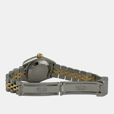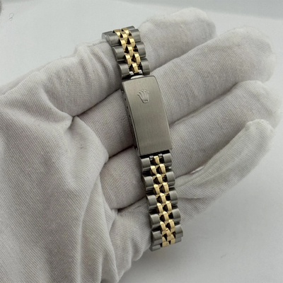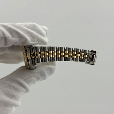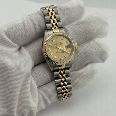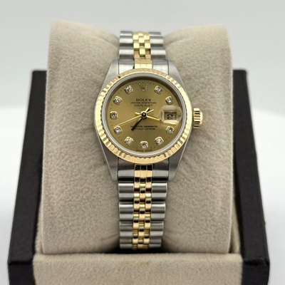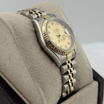This authentic 26 mm Rolex Datejust 79173 features a warm champagne dial framed by a stainless steel case with 18K yellow gold accents on the bezel and bracelet links. Designed for women who appreciate classic elegance, its automatic movement ensures reliable precision while adding a touch of luxury to both everyday wear and special occasions.