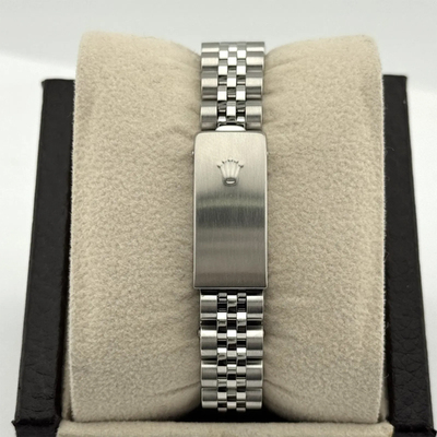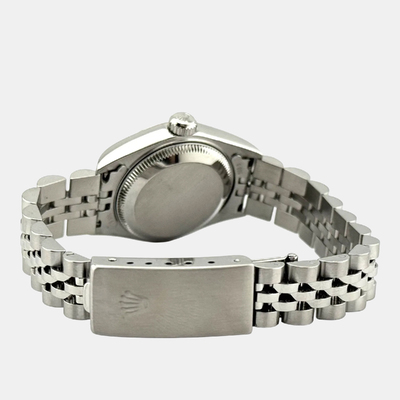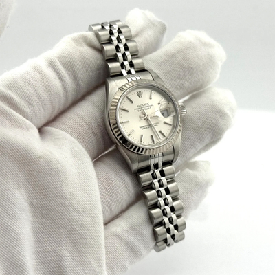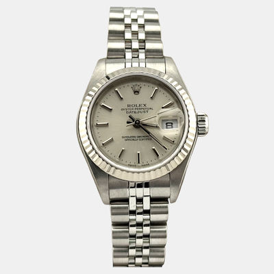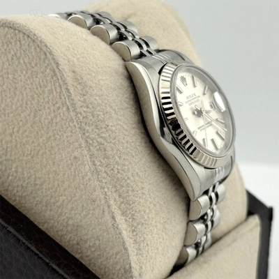 This 26 mm Rolex Datejust 79174 combines polished stainless steel with an 18K white gold bezel, highlighting a refined silver dial that radiates timeless sophistication. Its automatic movement ensures precise timekeeping, making it an elegant companion for both professional settings and graceful evening occasions.