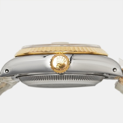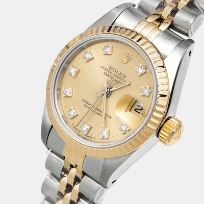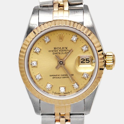 Radiant and enduring, the Rolex Datejust 69173 embodies the elegance that has made the collection a cornerstone of fine watchmaking. The 26 mm case in stainless steel and 18k yellow gold holds a champagne dial that glows with warmth and diamond hour markers. Completed by the signature fluted bezel and Jubilee bracelet, this automatic timepiece is an investment youll cherish.