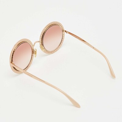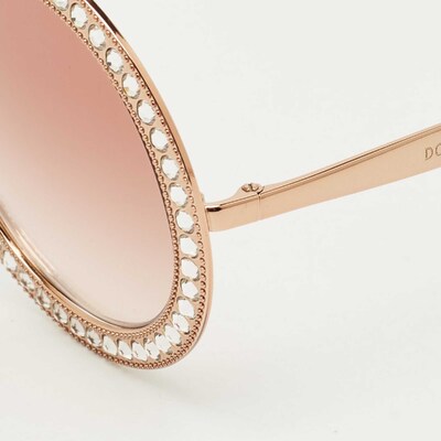 Dolce and Gabbana’s DG2170 B sunglasses pair rose gold gradient lenses with crystal detailing on round frames. The sparkle reflects the brand’s baroque approach to glamour. A striking way to frame the face on bright days.