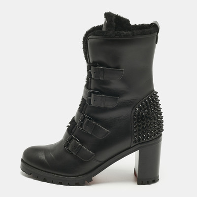 Bold and edgy, these Christian Louboutin combat boots combine smooth black leather with cozy shearling lining. Finished with signature spike embellishments, they balance tough luxe styling with winter ready comfort. A striking pair with iconic red soles.