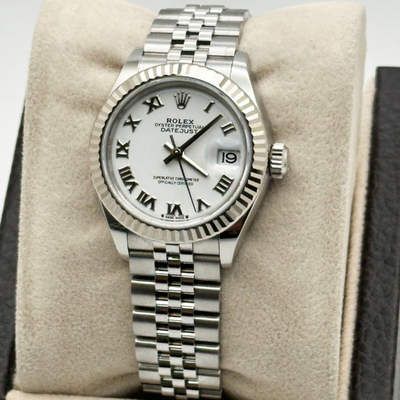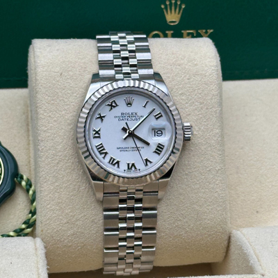 Timeless and luminous, this Datejust highlights a pure white dial accented by an 18k white gold bezel. Its 28 mm stainless steel case delivers everyday wearability, while Rolex’s automatic movement ensures accuracy and grace.