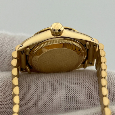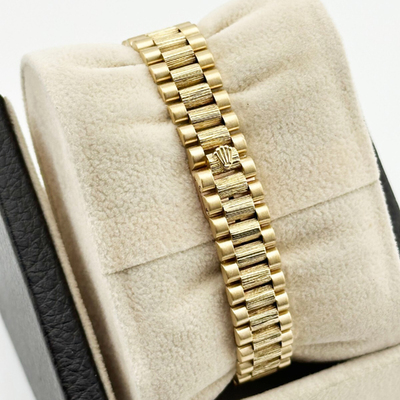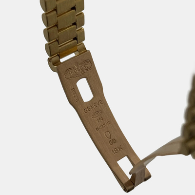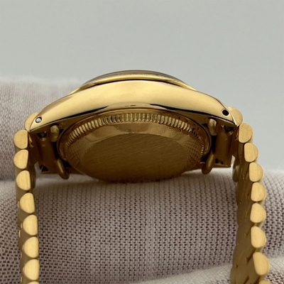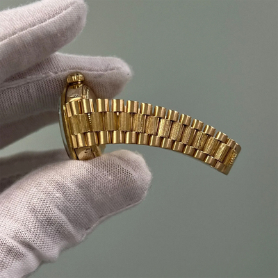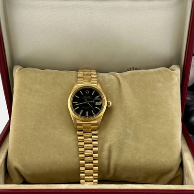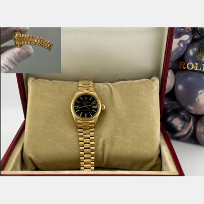 This striking President model radiates classic opulence with its full 18k yellow gold construction and bold black dial. The deep contrast adds dramatic sophistication, while the automatic movement underscores Rolex’s legacy of precision and luxury craftsmanship.