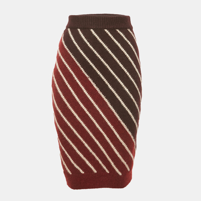 This Stella McCartney midi skirt is designed in a burgundy and red chevron wool blend knit. Its flared silhouette adds movement and modern elegance. A bold yet timeless choice for seasonal dressing.