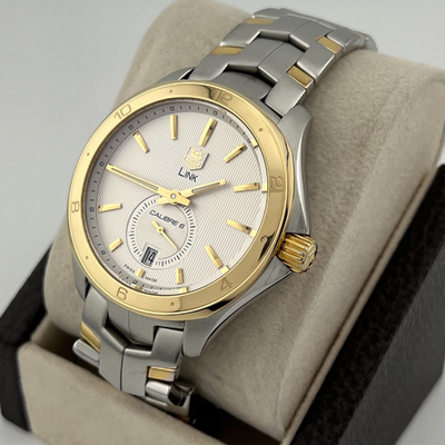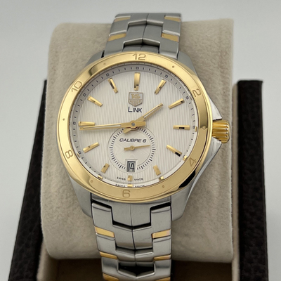 Designed with confident sophistication, this Tag Heuer Link Calibre 6 combines robust stainless steel with radiant 18k yellow gold accents. Its smooth automatic movement and clean dial reflect the brand’s dedication to performance and refined luxury.