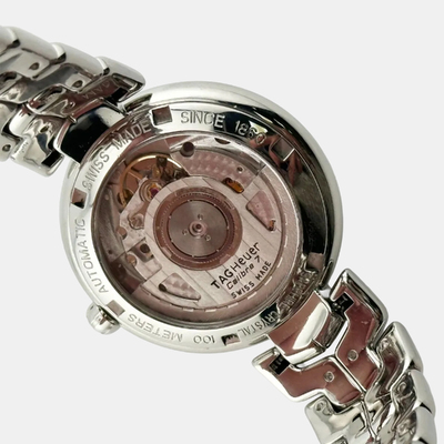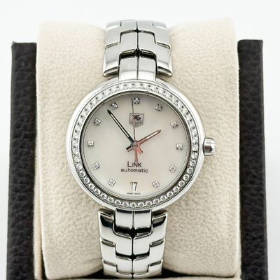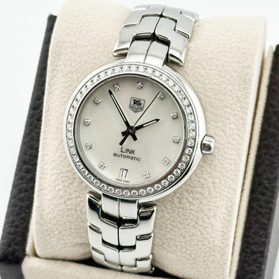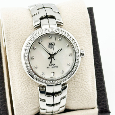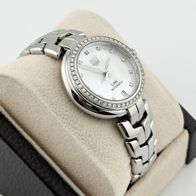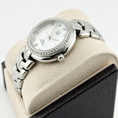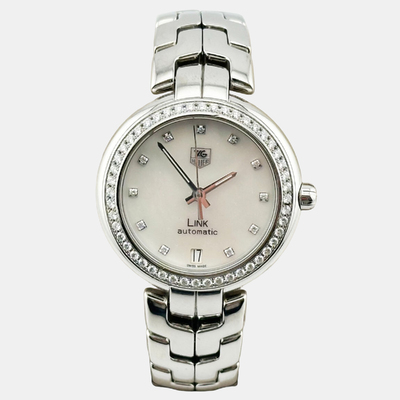 Tag Heuer celebrates feminine elegance in this Link timepiece, where a luminous white mother of pearl dial shimmers beneath sparkling diamond markers. The sleek stainless steel bracelet and smooth automatic movement deliver both beauty and dependable Swiss precision.