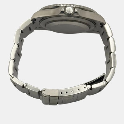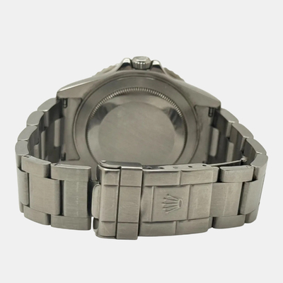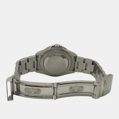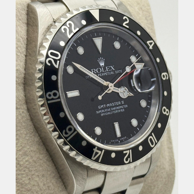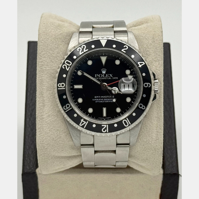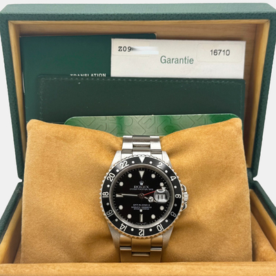 Sleek and versatile, this 40 mm Rolex GMT Master II 16710 pairs a stainless steel case with a deep black dial and bezel. Designed for global explorers, its dual time feature and automatic movement make it a practical yet sophisticated everyday watch.