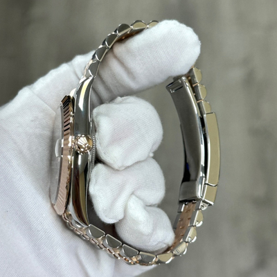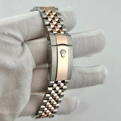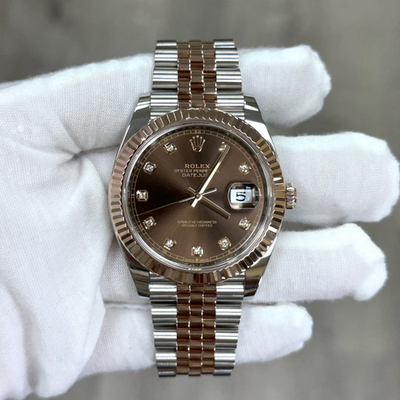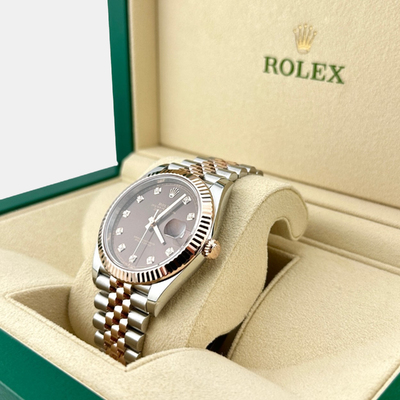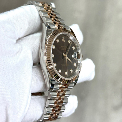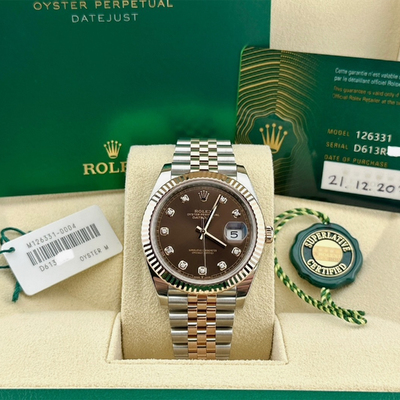 The Rolex Datejust 126331 showcases a chocolate dial accented with diamonds and 18K rose gold, delivering a warm, sophisticated presence. Its 41mm case balances boldness with classic Rolex elegance.