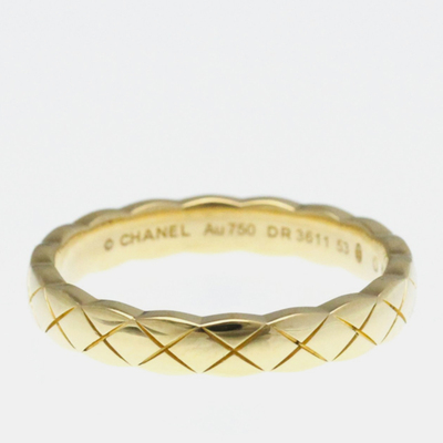 The Chanel Coco Crush Mini Ring in 18K yellow gold embodies understated sophistication. Its delicate quilted motif and polished finish make it a subtle yet iconic statement piece for everyday luxury.