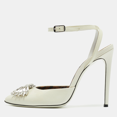 White patent leather forms a glossy base, adorned with sparkling crystals across the uppers. A slender ankle strap secures the fit, blending glamour with high craftsmanship for a statement heel that catches the light at every step.