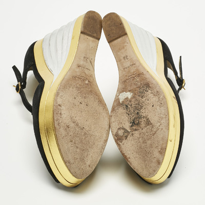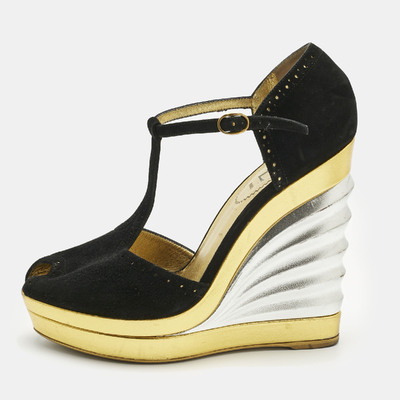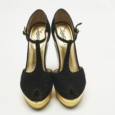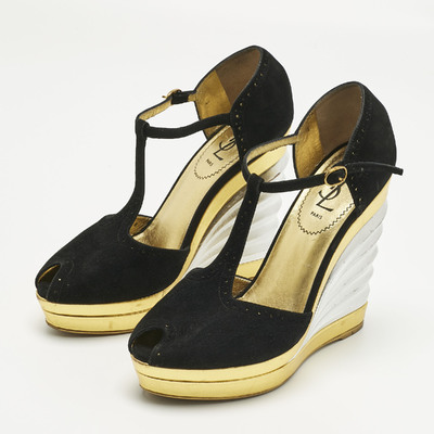 Yves Saint Laurent’s Metallic Disco Wedges are crafted from black suede. The peep toe and T bar front strap give character, while the side buckle keeps the fit secure. With a metallic wedge heel that adds lift, they pair effortlessly with dresses or tailored pants for a night out or a special occasion.