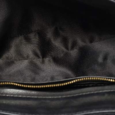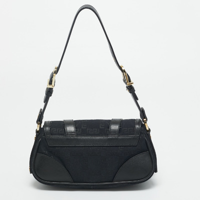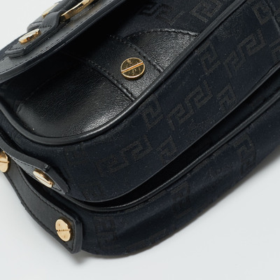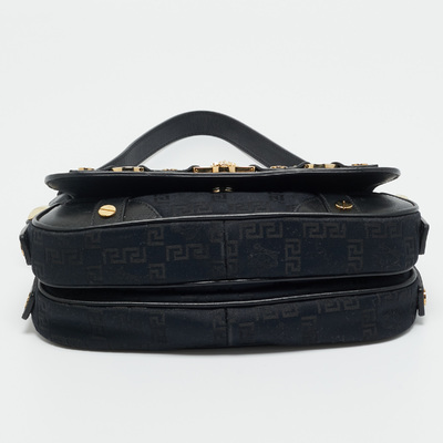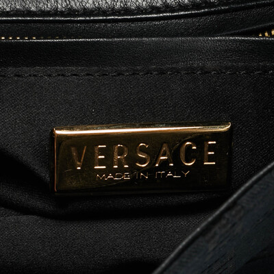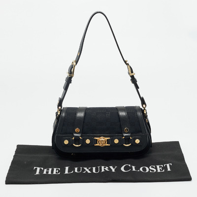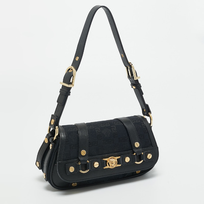 Versace’s shoulder bag combines black monogram fabric with leather accents and Medusa studded hardware. Its structured silhouette and bold details reflect the brand’s signature opulence. Perfect for adding a luxurious edge to any outfit.