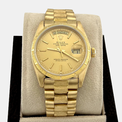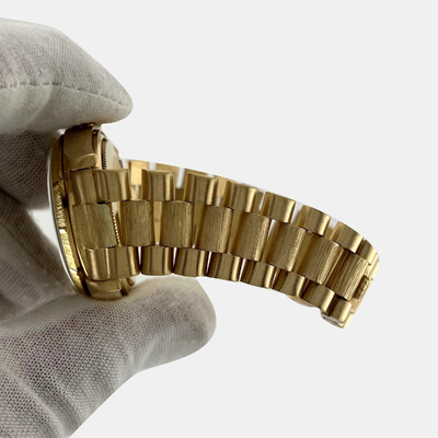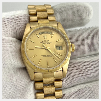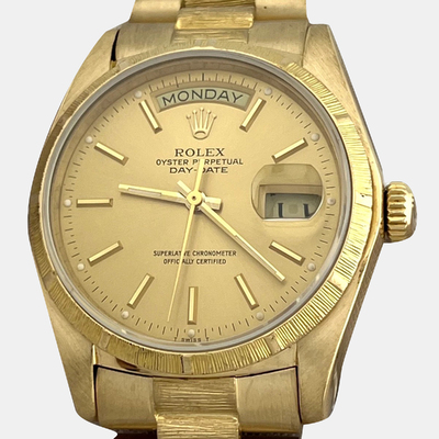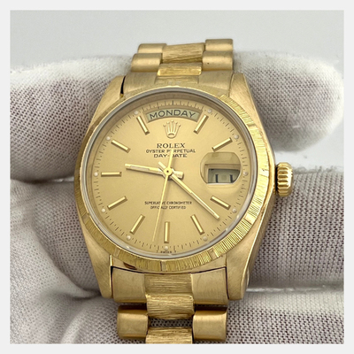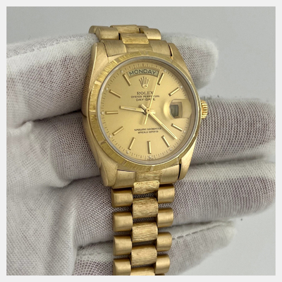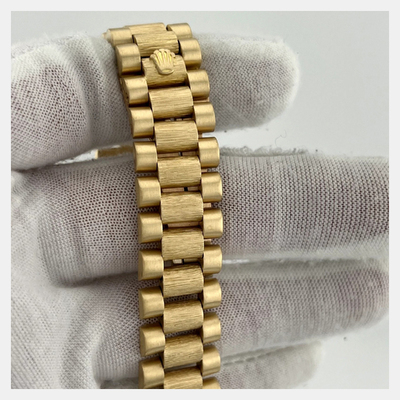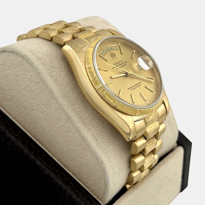 With a champagne dial and 18K yellow gold case, the Day Date 18078 blends elegance and authority. Its 36 mm case and automatic movement ensure accurate timekeeping, making it perfect for formal occasions or executive settings. This pre owned Rolex embodies the pinnacle of refined taste and prestige.