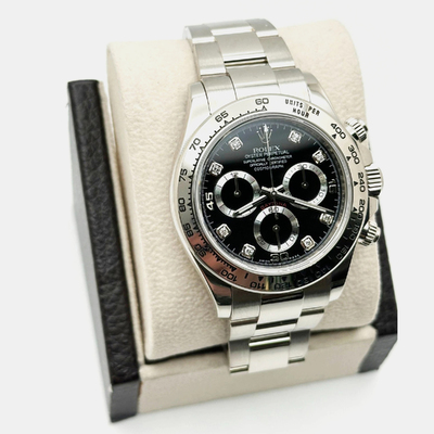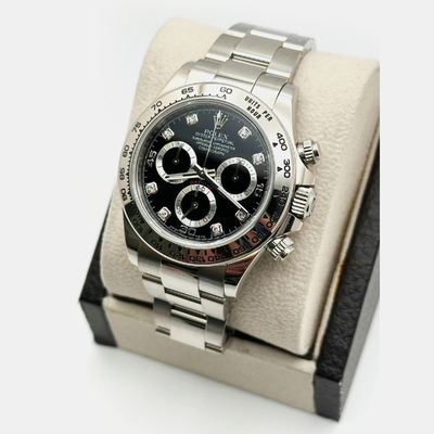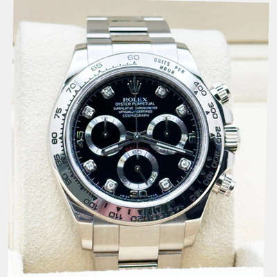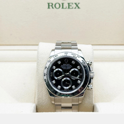 Decadent yet disciplined, this white gold Daytona balances raw performance with opulent detail. Diamond accents shimmer against a sleek backdrop, elevating the chronograph’s functionality into wearable fine art. It’s for those who demand excellence in every measure, including style.