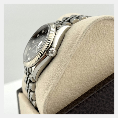Exuding sparkling refinement, the Datejust 278274 features a grey diamond dial with 18K white gold and stainless steel. Its 31 mm case and automatic movement ensure precision and elegance. Ideal for gala evenings, boardroom meetings, or stylish casual wear, this pre owned Rolex is a true collector’s choice.