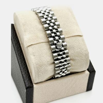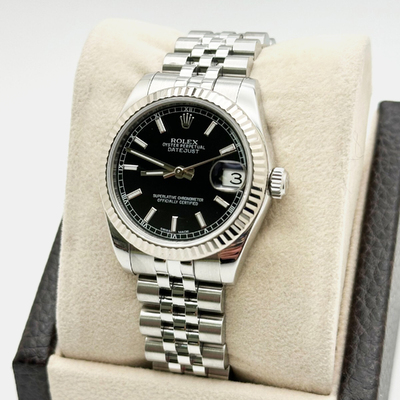 The Rolex Datejust 178274 commands attention with a black dial set within stainless steel and 18K white gold. Its 31 mm case houses a precise automatic movement, offering both reliability and elegance. Ideal for formal events or sophisticated everyday wear, this pre owned timepiece balances classic Rolex craftsmanship with modern style, making it a subtle yet striking statement on the wrist.