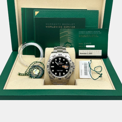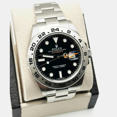 Adventure meets luxury with the Explorer II 216570, boasting a black dial in stainless steel. Its 42 mm case and automatic movement deliver reliability and precision for active lifestyles. Perfect for travel, exploration, or casual sophistication, this pre owned Rolex combines rugged functionality with iconic design.
