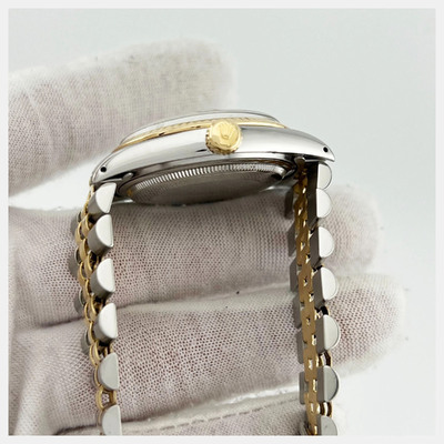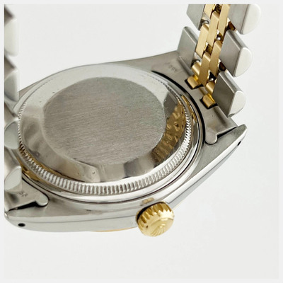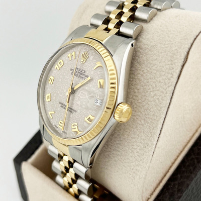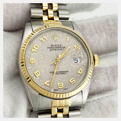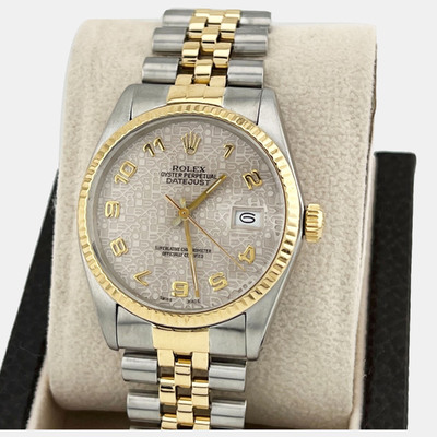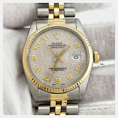 This authentic pre owned Rolex Datejust 16013 features a gold Jubilee Arabic dial with precise automatic movement. Crafted in 18K yellow gold and stainless steel, the 36 mm case is ideal for a classic wrist presence. Perfect for formal occasions, office wear, or refined casual outings, it blends elegance with durability.