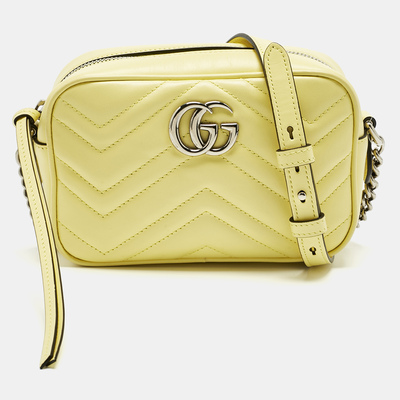 This authentic Gucci Mini GG Marmont Camera Bag, crafted from yellow matelassé leather, adds a bright, joyful touch to any outfit. Its chain and leather strap can be worn over the shoulder or across the body, giving flexibility for day or evening. The GG logo and soft quilting make it unmistakably Gucci.