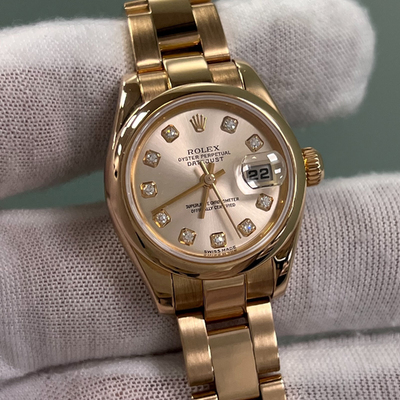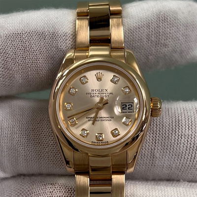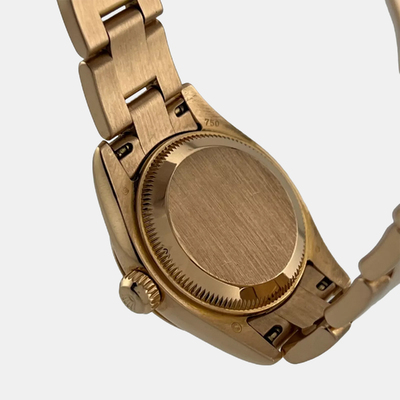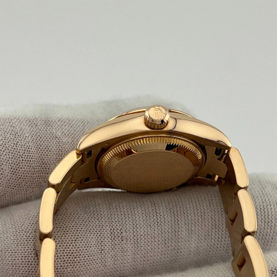 The Rolex President Datejust 179165 in 18k rose gold is a study in elegance and precision. Measuring 26 mm, its refined proportions are enhanced by a dial accented with pink diamond details, lending a subtle radiance. Powered by an automatic movement, this timepiece reflects Rolex’s mastery of craftsmanship and timeless design.