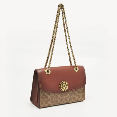Coach’s Parker bag is crafted in signature coated canvas with brown leather trims. Its turn lock closure and chain strap give it a polished appeal. Spacious and chic, it’s ideal for everyday use.