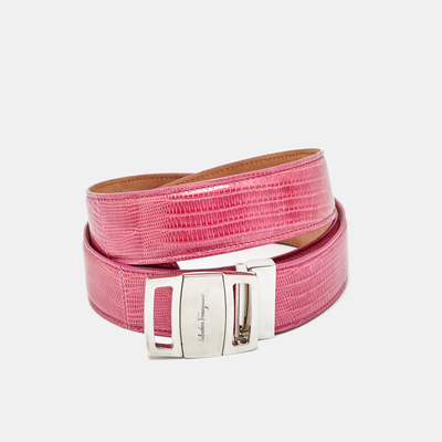 Salvatore Ferragamo’s belt is cut from exotic pink lizard leather and finished with an adjustable buckle. The textured material brings luxury to even the simplest outfits. A distinctive piece for those who appreciate refined detail.
