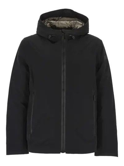 black zip fastening side zip pockets hood long sleeves straight hem