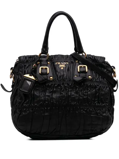 gathered nappa leather body rolled leather handles detachable strap top zip closure interior zip and slip pockets black Inclusions: name tag, shoulder strap. Condition: GOOD. This previously owned and used item is in good condition with minimal signs of use. This may include fading of material or plating and scratches. Declared Damages: Handle/Strap Feature(s) Moderate Cracks. Handle/Strap Feature(s) Moderate Rip. Please refer to the photos on this product page for a detailed view of the item, including any damages declared.