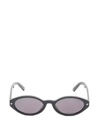 black oval frame star detail logo lettering tinted lenses These glasses come with a protective case.